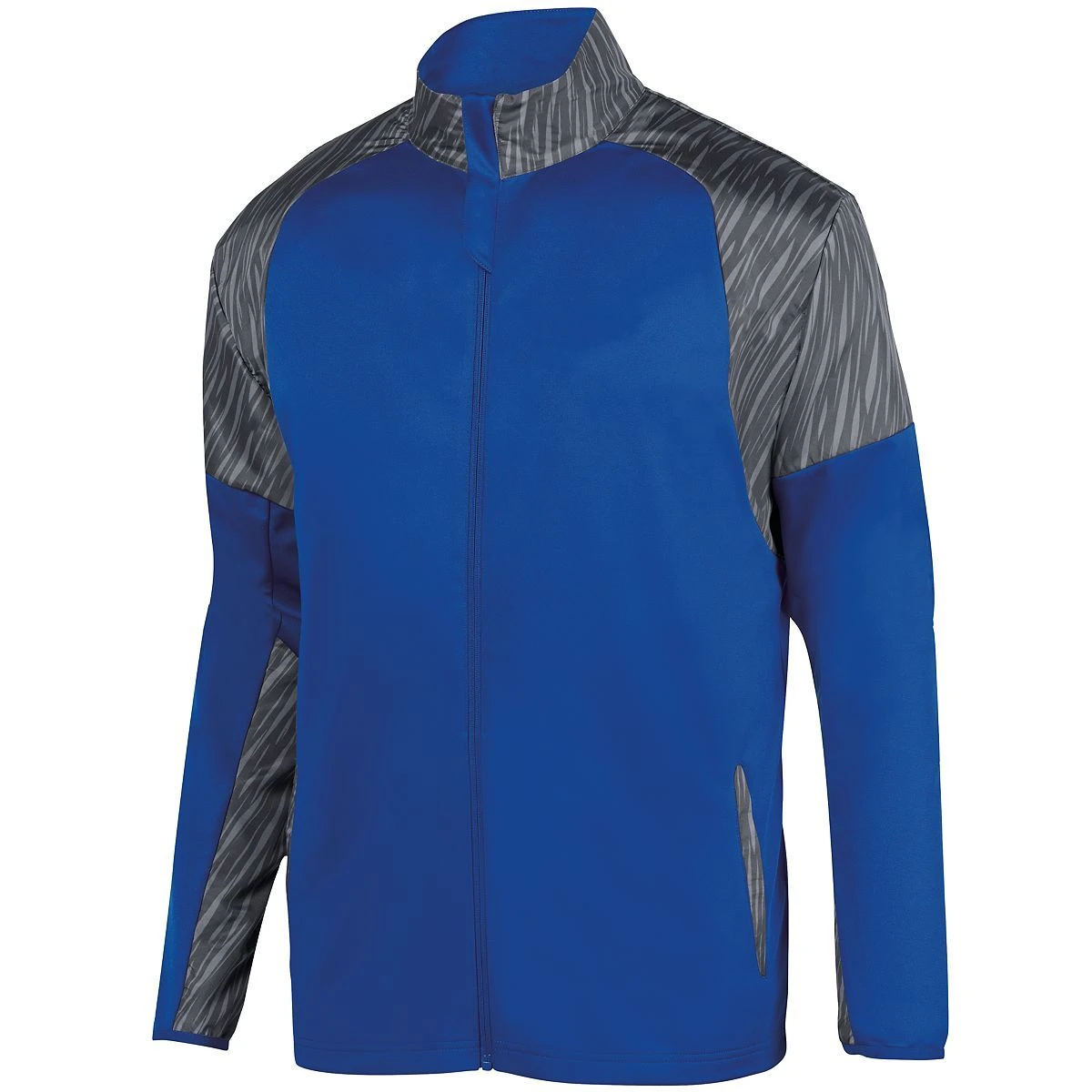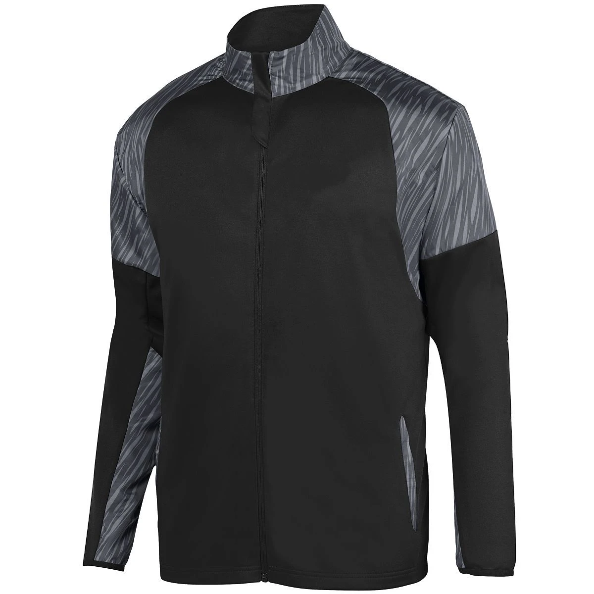 100% polyester sublimated micropoly upper body featuring Breaker print * 100% polyester knit interlock lower body * Hybrid design with micropoly on shoulders, collar, and sleeve for rain and wind resistance combined with knit lower body for warmth * Heat sealed label * Extended zipper garage with storm flap * Cadet collar * Set-in sleeves * Front pockets * Spandex bound cuff * Open bottom