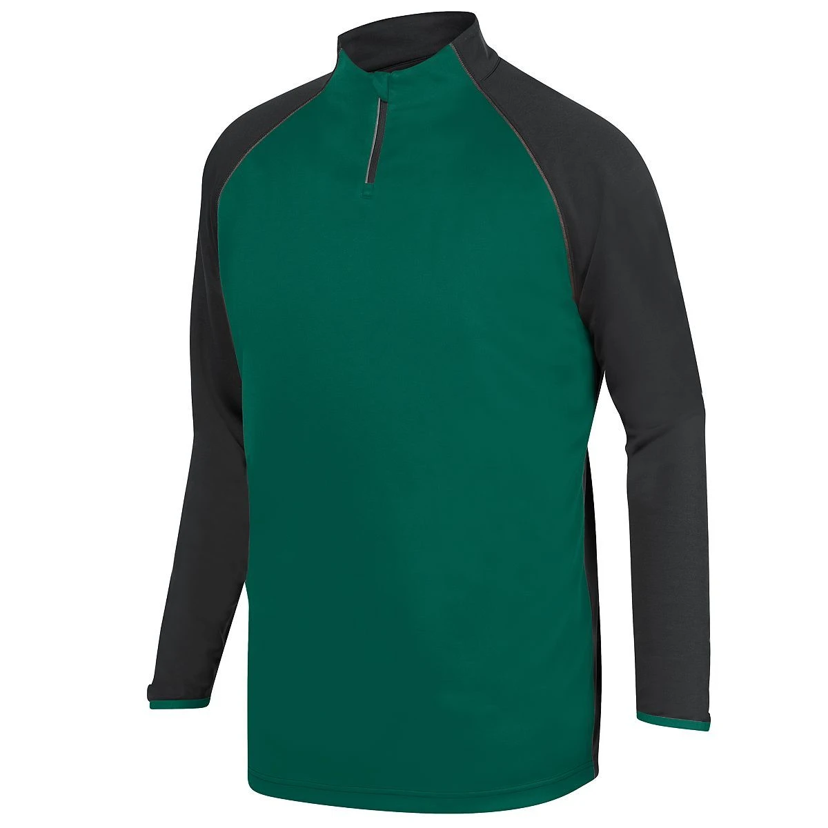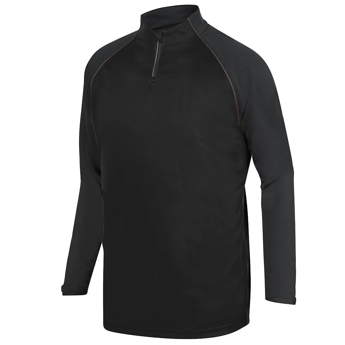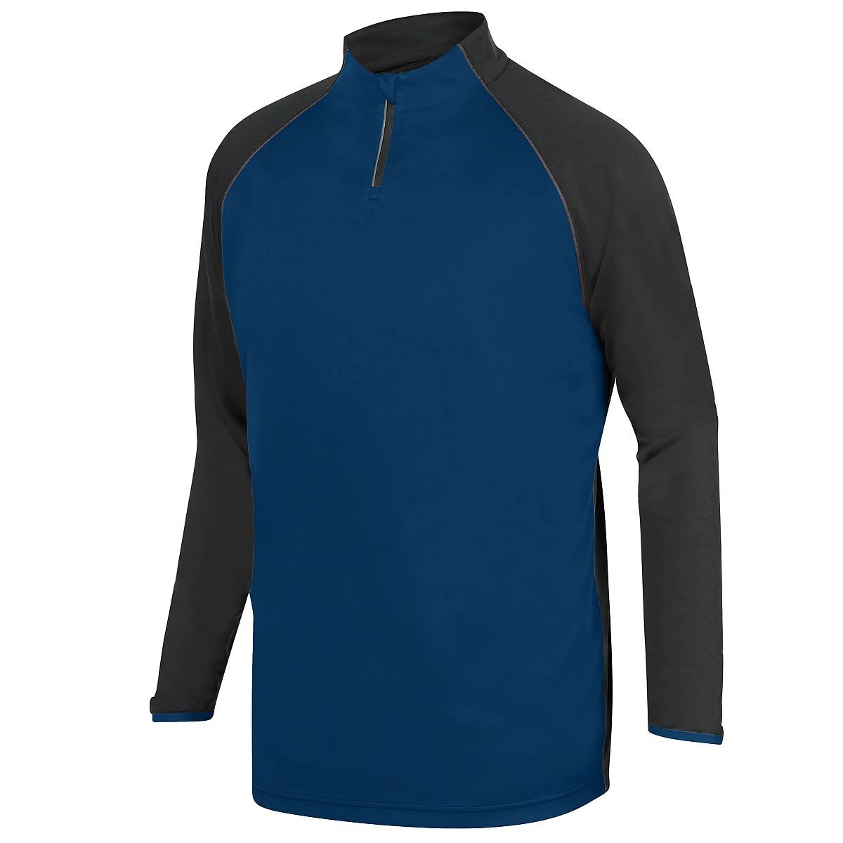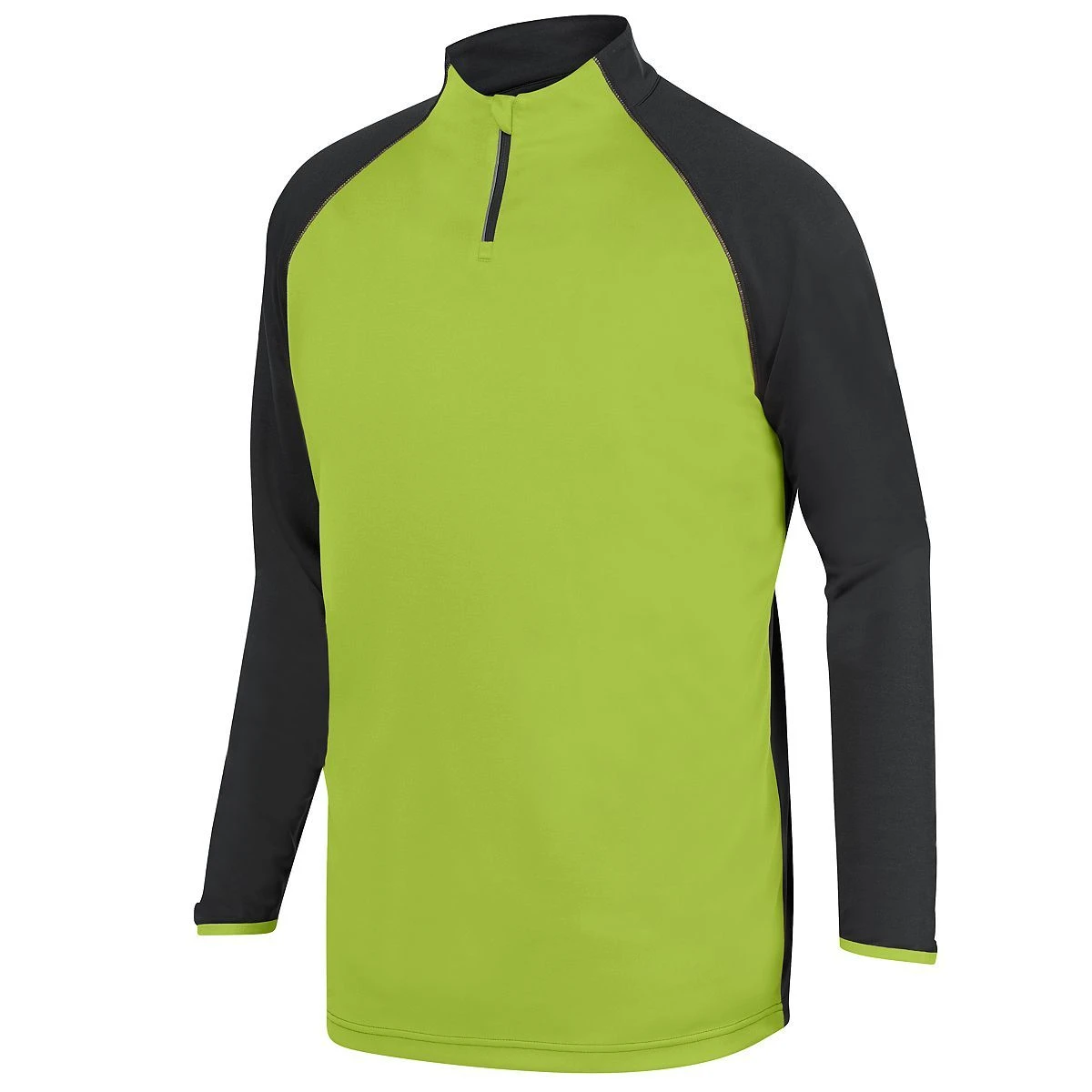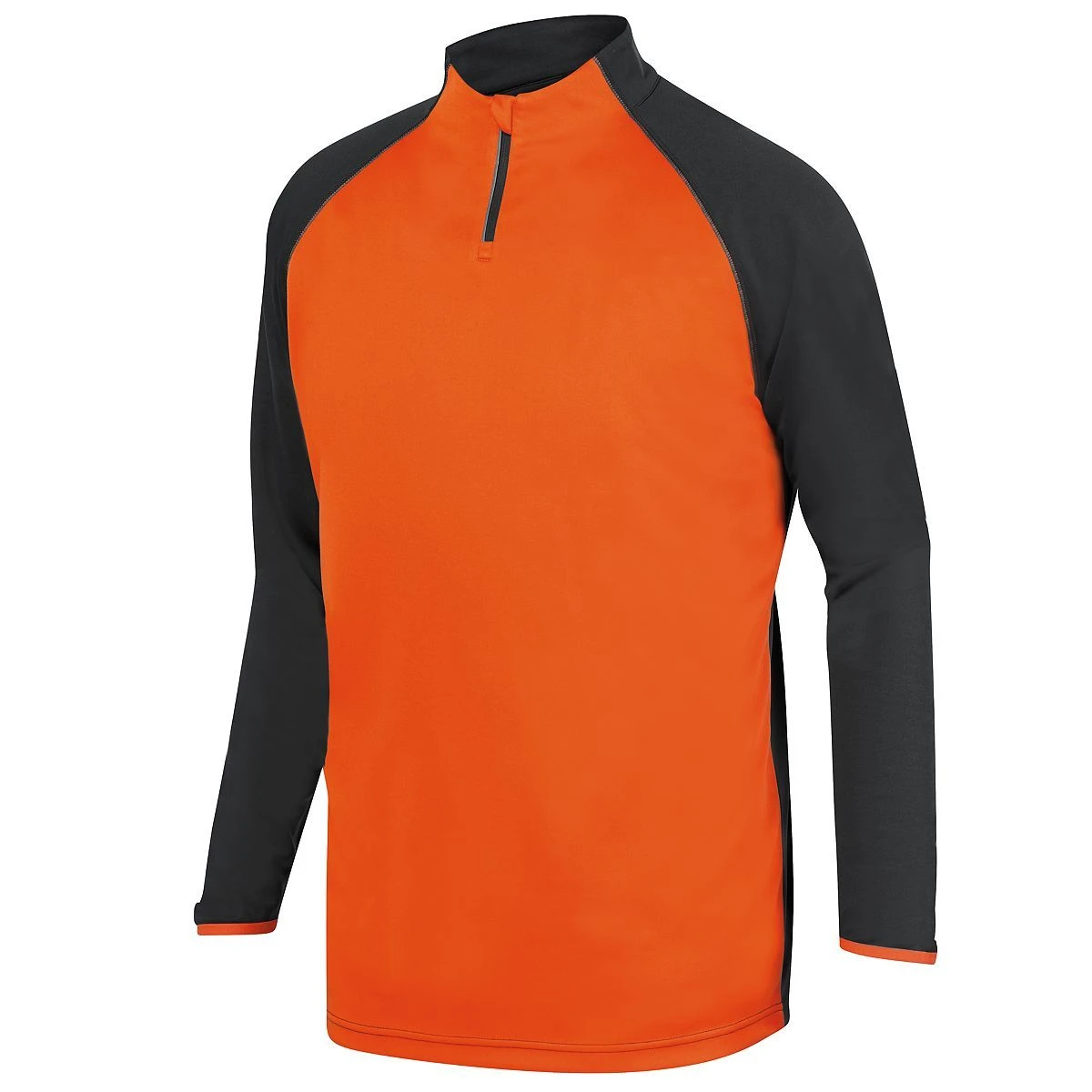100% polyester knit interlock * Tagless label * Quarter zip pullover style and reflective tape * Zipper garage with storm flap * Contrast color front panel and spandex bound cuff * Wearer’s right side seam hidden possession pocket * Raglan sleeves for maximum mobility * Open bottom –