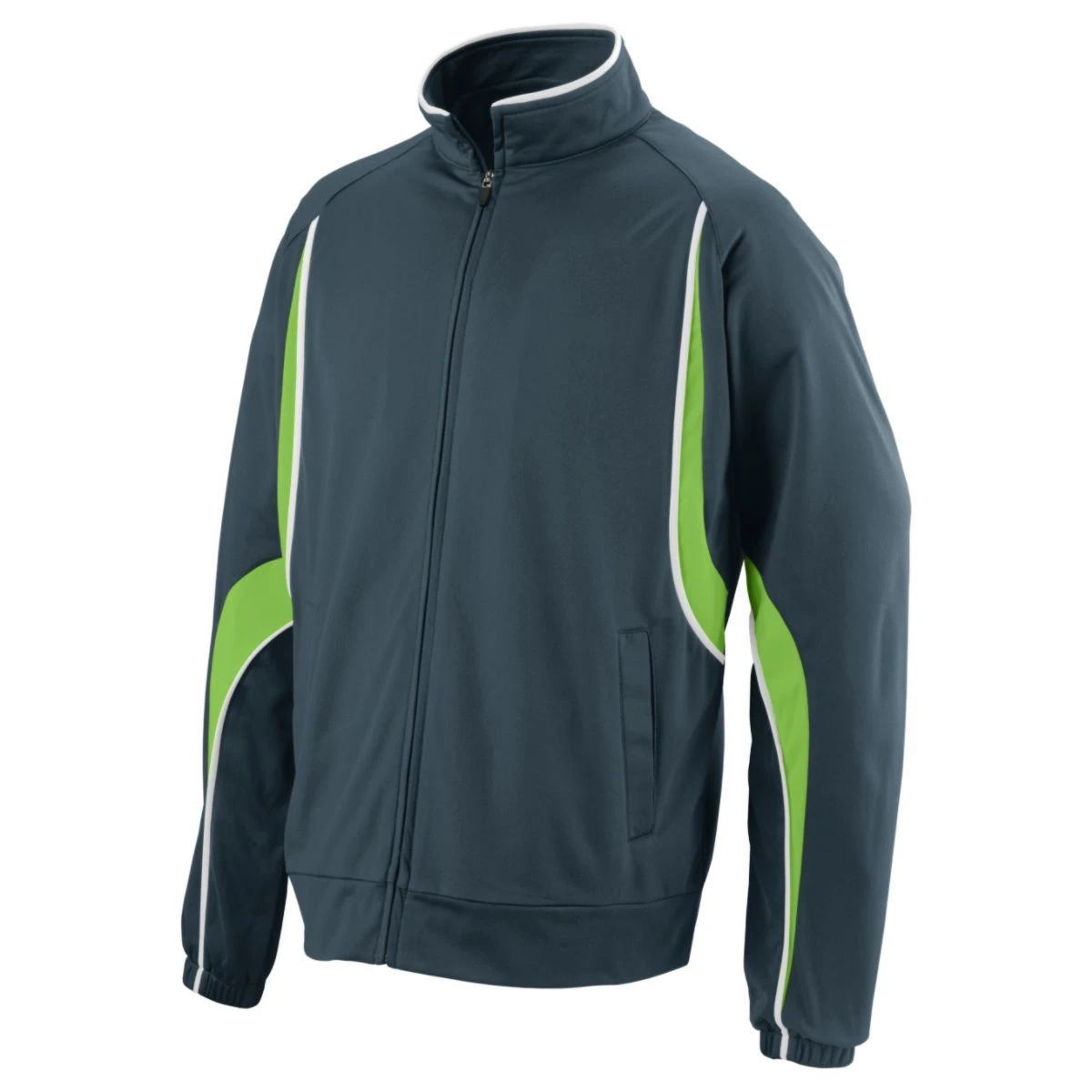 Heavyweight 100% polyester matte brushed tricot * Woven label * Front zipper * Contrast color inserts and piping * Raglan sleeves for maximum mobility * Front pockets * Elastic cuffs * Open bottom