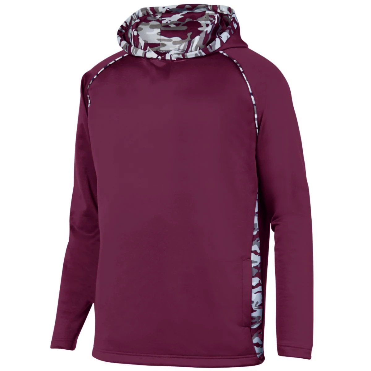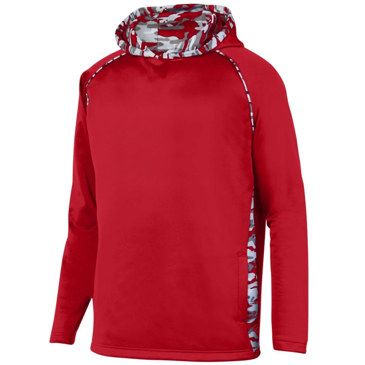 5.9 ounce 100% polyester performance wicking fleece * 3.35 ounce, 100% polyester printed wicking knit side inserts, piping, and hood lining features Mod Camo print * Roller printed to reduce chance of dye migration * Wicks moisture * Tagless label * Drawcord on Adult sizes only * Raglan sleeves * Front pouch pocket * Self-fabric cuffs * Open bottom