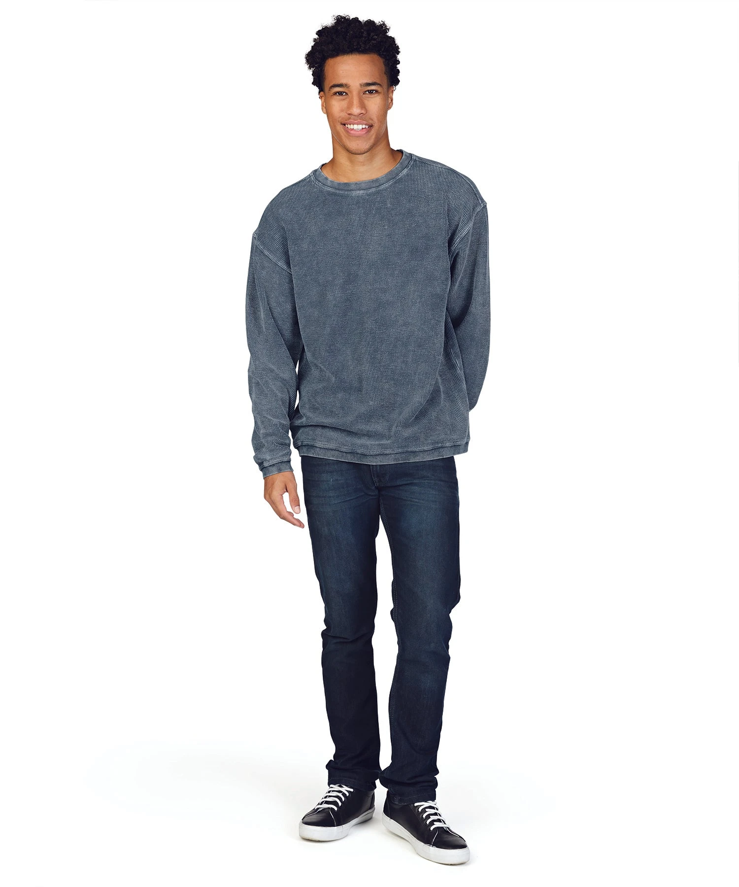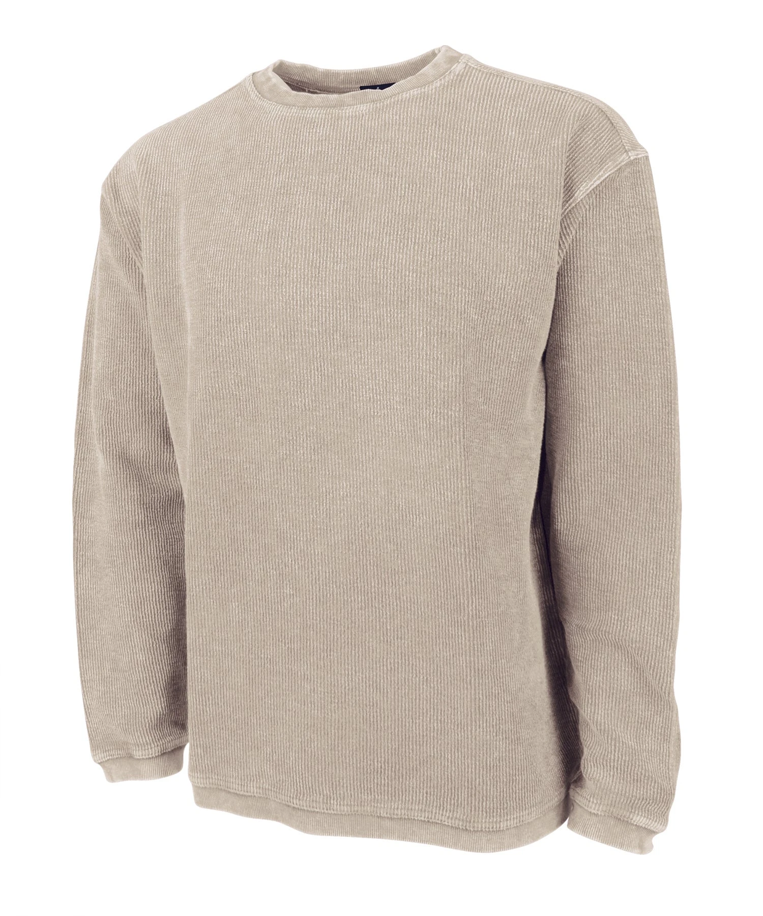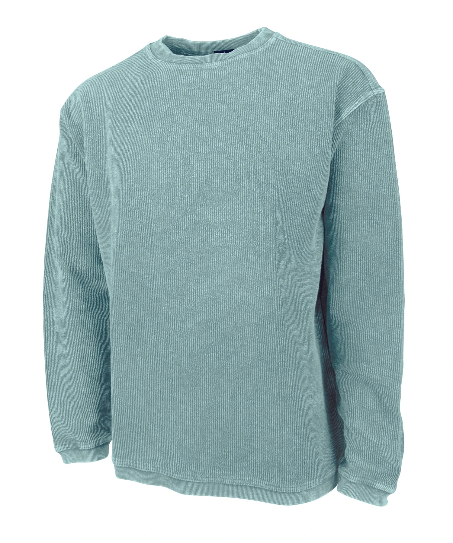 - Features crew style neck with rib knit trim on neckline, cuffs and hem