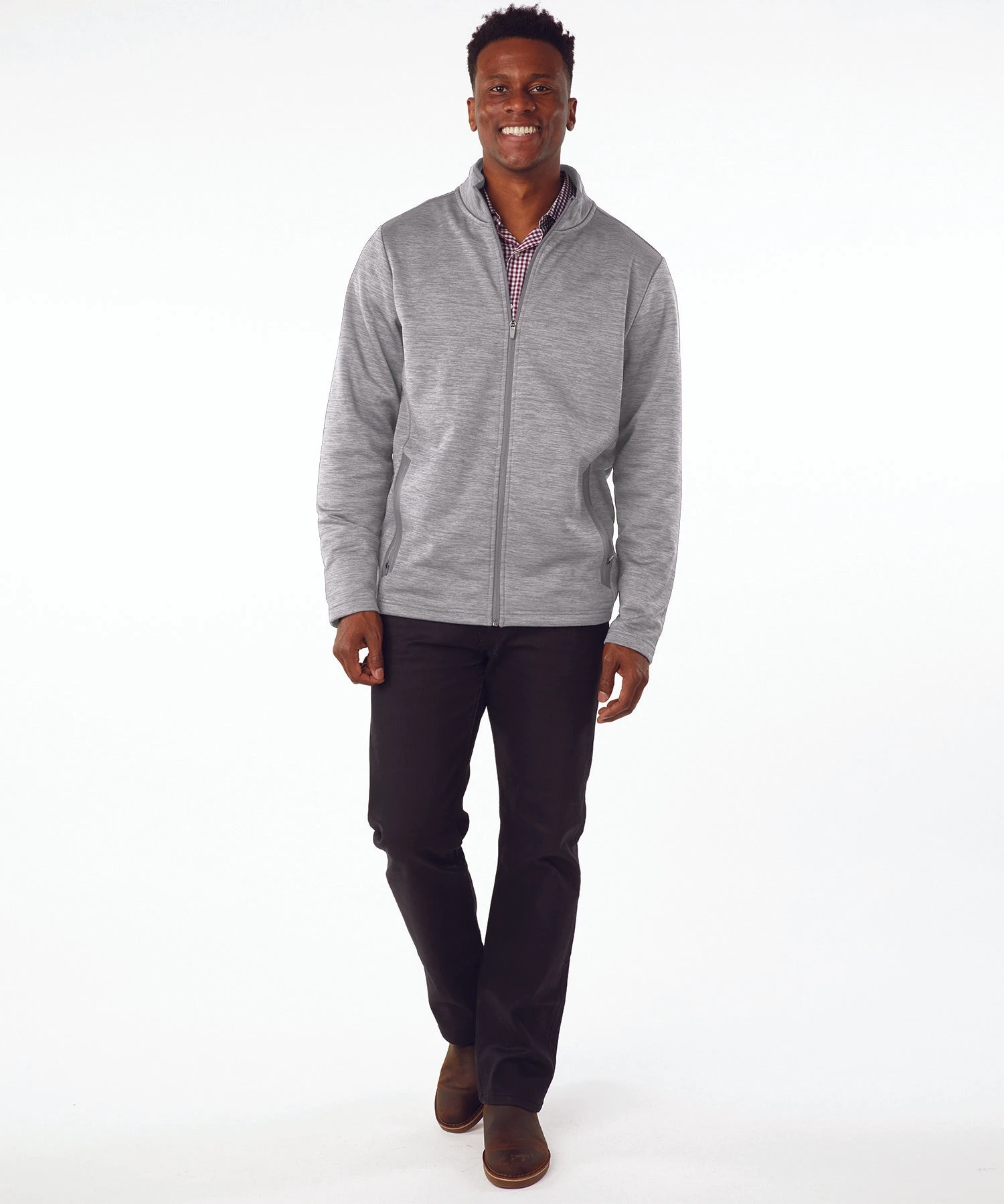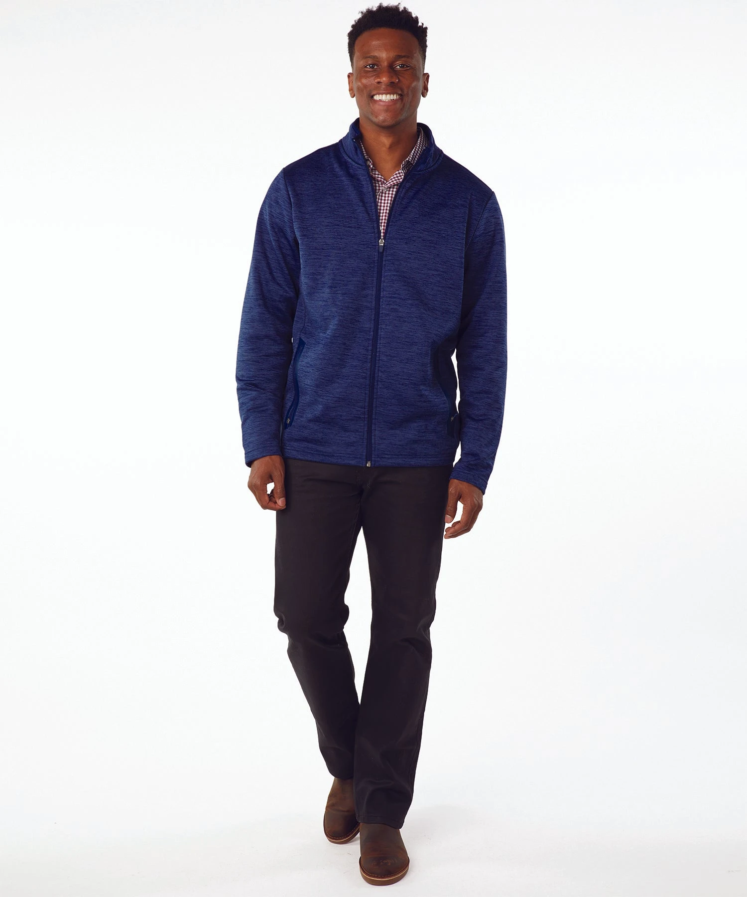 - Yarn-dyed full zip mock neck with a brushed fleece inside for added comfort and style
