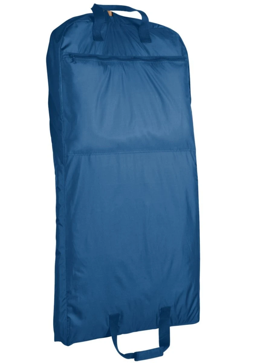 420-denier nylon with PU coating * Bag folds with handles for easy carrying * Full front zipper * Top opening for hanger extension * Outside zippered pocket compartment on back * Matching web handles with self-fabric handle wrapper reinforced at stress points * 22″ x 40″ x 3″